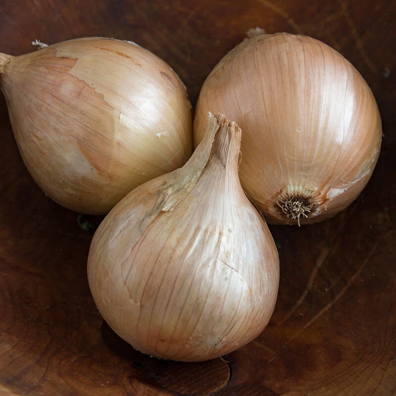 A classic mild onion with excellent size potential. Jumbo to colossal, round to teardrop-shaped bulbs with light yellow skins. Use fresh or for short-term storage. Adaptation: 38–60° latitude. Available pelleted and as plants.