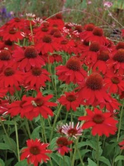Intense, red daisy-like flowers with dark cones, produced on strong, well branched stems. Attractive to butterflies and bees Echinacea Salsa Red is free bloomer from mid-summer, for months until fall. The petals retain color, bright red and stunning in groupings along Agastache, Phlox and Sedum. Sombrero Salsa Red Coneflower is lightly-scented and the flowers are excellent for cutting. Echinacea purpurea, commonly known as purple coneflower, is an herbaceous perennial that is native to the central to southeastern United States. Easy-to -grow plants tolerant of drought, heat, humidity and poor soil. They bloom with showy, daisy-like flowers from mid-summer until first frost. Fundamental flower for the perennial border, natural meadow, butterfly or pollinator garden, or native wildflower garden.